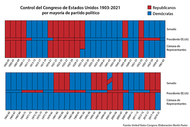 Si bien es una lista larga, esta ignora acusaciones y otro tipo de intervenciones en la política local, economía y rumbo de los países, comúnmente realizadas a través de la misión diplomática y organizaciones no gubernamentales. Lo importante es que al comparar la conformación del legislativo estadounidense desde 1903 hasta 2021 (Ver Gráfico) con las injerencias mencionadas anteriormente, todas las acciones han sido ejecutadas indeterminadamente por presidencias y congresos demócratas o republicanos. El partido y su mayoría en el Senado o Cámara de Representantes nunca ha sido un indicador diferencial para la región.