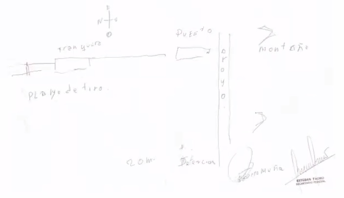 Permaneció colgado algunos días hasta que le dispararon en el pecho, del lado izquierdo. Por la herida perdió la pleura y parte del pulmón. En ese estado se le cayó la venda y supo que estaba en Las Lajas. Muñoz mencionó un puesto y un arroyo con poco caudal. Para facilitar la descripción, a pedido del fiscal el testigo realizó un croquis donde marcó la montaña, los puntos cardinales, el espinillo, el arroyo y el tiempo estimado para llegar de un lugar a otro. El tribunal compartió el documento con todas las partes.