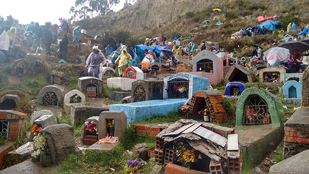 El profundo respeto por la mancomunión más la proverbial timidez de las mujeres y el contexto de tormenta hicieron prácticamente imposible que tomara testimonios. El primero fue Santos, que en medio de los baldazos de agua que nos caían resumió todo el significado de aquello como “un acto de amor por las personas que queremos”; luego vino Gery, que me habló de esa y otras tantas ceremonias-celebraciones que fortalecen el espíritu de sus pueblos; y cerró Sarita, la más sabia, que cuando le pregunté por la identidad y por Halloween se acordó de la posmoderna Santa Cruz de la Sierra y espetó: “por mí que se les caiga el cielo”. Mojado hasta los tuétanos opté por volver, ellos, ellas, no se moverían de ahí. Y otra vez: caminata entre vivos y muertos, teleférico uno, teleférico dos, pasarela descendente y la subida infinita.
