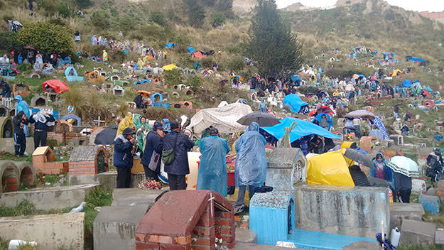 Repasé en segundos mis muertos y todos nuestros muertos, saludé a Néstor en el cielo, y me mimeticé entre la algarabía de las familias que compartían todo con sus difuntos en medio de corridas y urgidas protecciones por la lluvia helada en medio de las tumbas. No había desgarros, los gritos eran invocaciones felices a los cielos, las risas un conjuro a las inclemencias del tiempo y del destino, los rezos en aymara y en quechua, mezclados con español, una caricia a los seres queridos. La gente iba y venía, nenas y nenes correteaban entre las lápidas, las viejas y los viejos acurrucaban sus cuerpos en cuevita y una banda de musicantes no paraba de atronar los truenos.