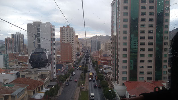 La jornada amenazaba torrencial ya desde la mañana, pero estaba decidido a aventurarme en el día feriado y así es como me sumí en el vertiginoso contraste entre la híper-modernidad y la arquitectura y el aire tradicional que por doquier brinda esta ciudad. Desde la altura de “mi cerrito” bajé las quince cuadras hasta las avenidas que desembocan en El Prado, di con la pasarela espejada y de muy reciente construcción que conecta a través de ascensores la línea azul con la línea blanca del teleférico, me fui embriagando con el paisaje alucinante de la urbe bajo lluvia, pagué mi boleto con “conexión” y por vez primera subí a una cabina blanca. Cruzando Miraflores saludé como un estúpido a mi lugar de trabajo y, mientras sobrevolaba la avenida Busch, puse ojos, oídos y corazón en un matrimonio con una nena y un nene que supe, por sus bolsos y su dicha particular, llevaban el mismo itinerario que el mío.