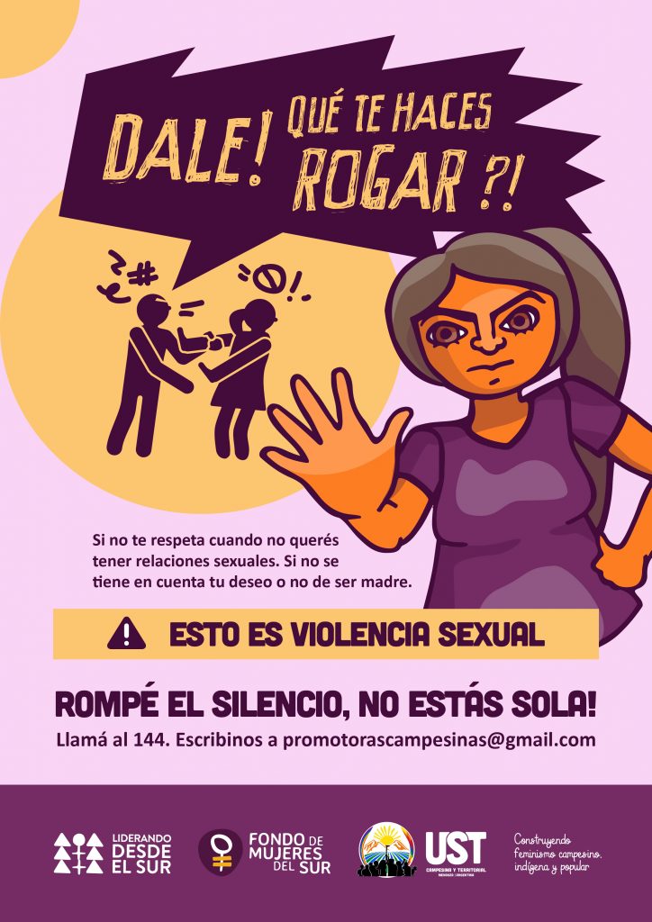 Es por esto que en Mendoza y en Lavalle, la UST Campesina y Territorial con el apoyo del Fondo de Mujeres del Sur lanza la campaña: “Rompé el silencio, no estás sola”, destinada a mujeres rurales que sufren estas diversas formas de violencia, “Venimos trabajando desde hace muchos años en una red de promotoras de género que asesoran, acompañan y buscan generar estrategias para enfrentar la violencia patriarcal en nuestras comunidades.” manifestó Verónica Pascual de Jocolí, integrante de la UST Campesina y Territorial.
