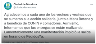 A esto se le suma un condimento más: se celebró, por el motivo del 9 de julio, un “locro solidario” en el hotel Hyatt con conocidos funcionarios públicos que desde días atrás promocionaban el mismo. La movilización que tenía como motivo reflejar la paupérrima acción gubernamental en un reclamo tan importante como el salario, se vio pisoteada con un Tweet de la cuenta oficial de la Ciudad de Mendoza en donde se lamentaba que los pedidos se estuviesen entregando tarde por la “manifestación”.