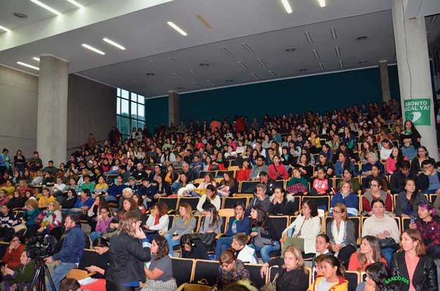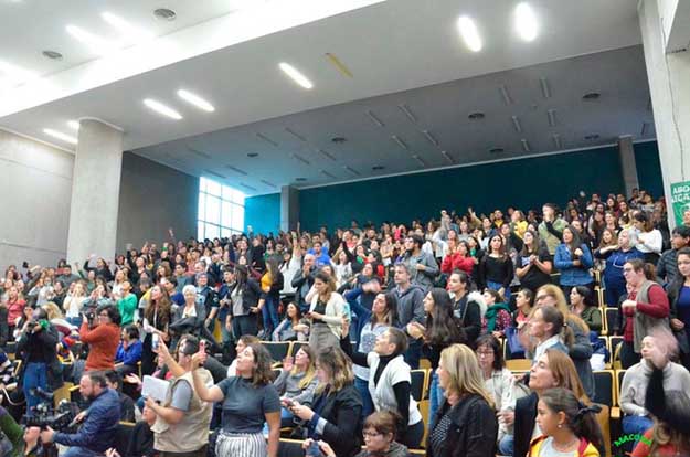La conferencia se llevó a cabo en el aula magna de la facultad. Allí Viviana Beigel, abogada de las víctimas, dio detalles de las acusaciones en contra de Mauro Aguirre, de la cátedra Doctrina Social II de la Carrera de Ciencia Política y Administración. El docente, que fue detenido la semana pasada, está imputado por siete hechos de abuso sexual que se habrían producido entre 2010 y 2015, aunque se estima que se podrían sumar otros casos.